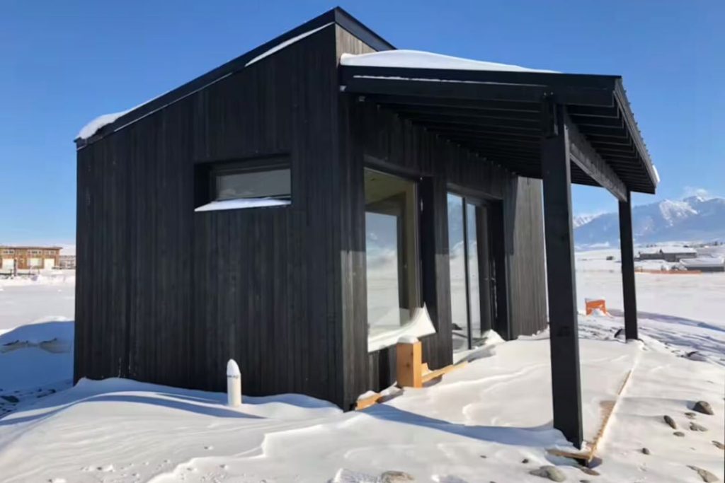 A pair of small, rectangular buildings covered in middles sits on a patch of snow ground. Forests are reflected in the mirrors.
